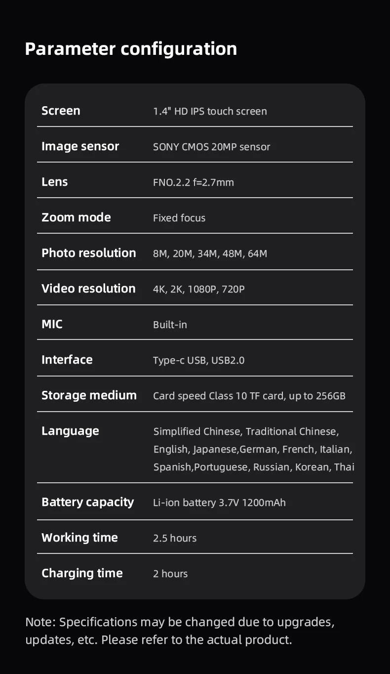 Memory Card: Class 10 micro SD card, supports up to 256G (not included)