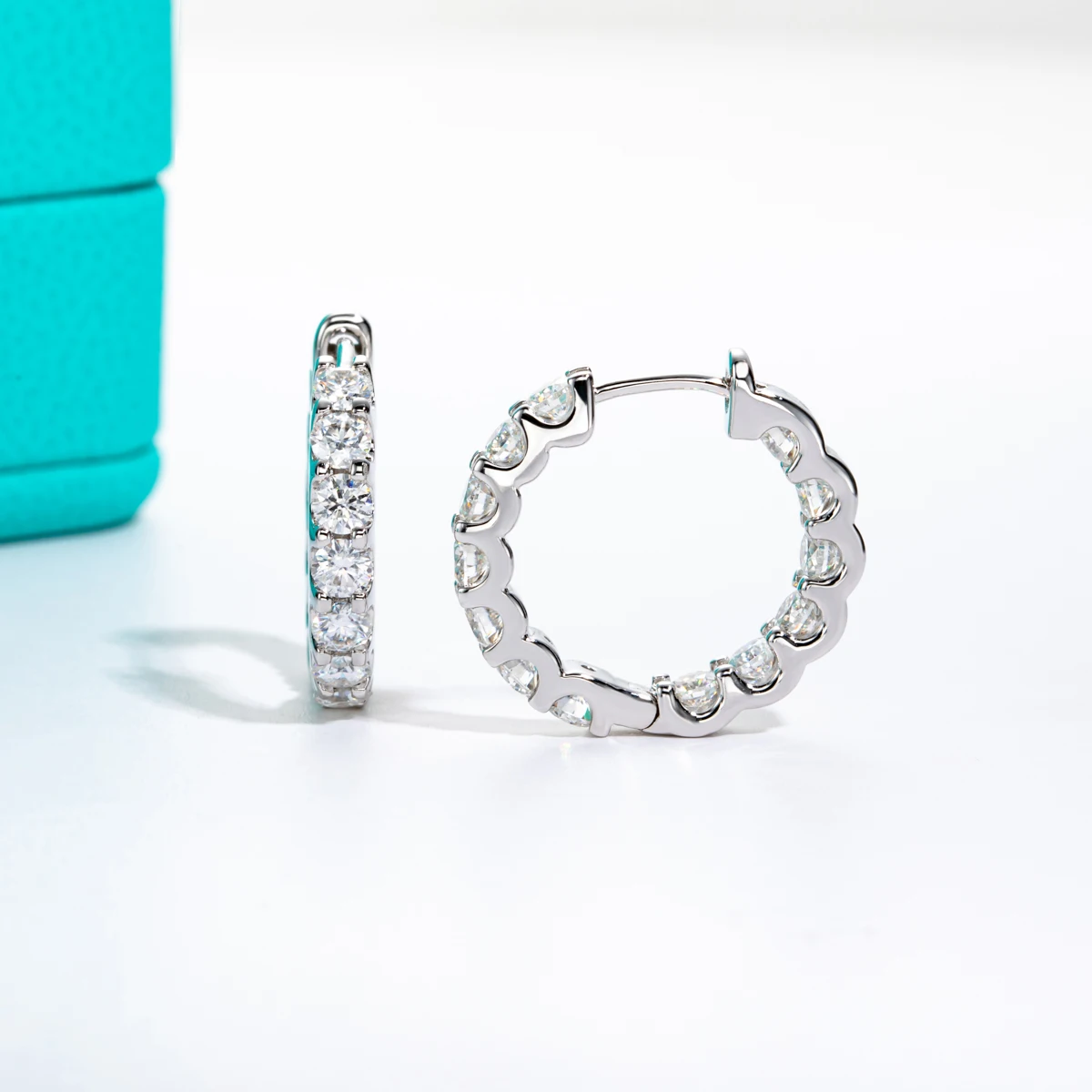 The classic hoop design paired with round moissanites creates a luxurious huggie look for any occasion.