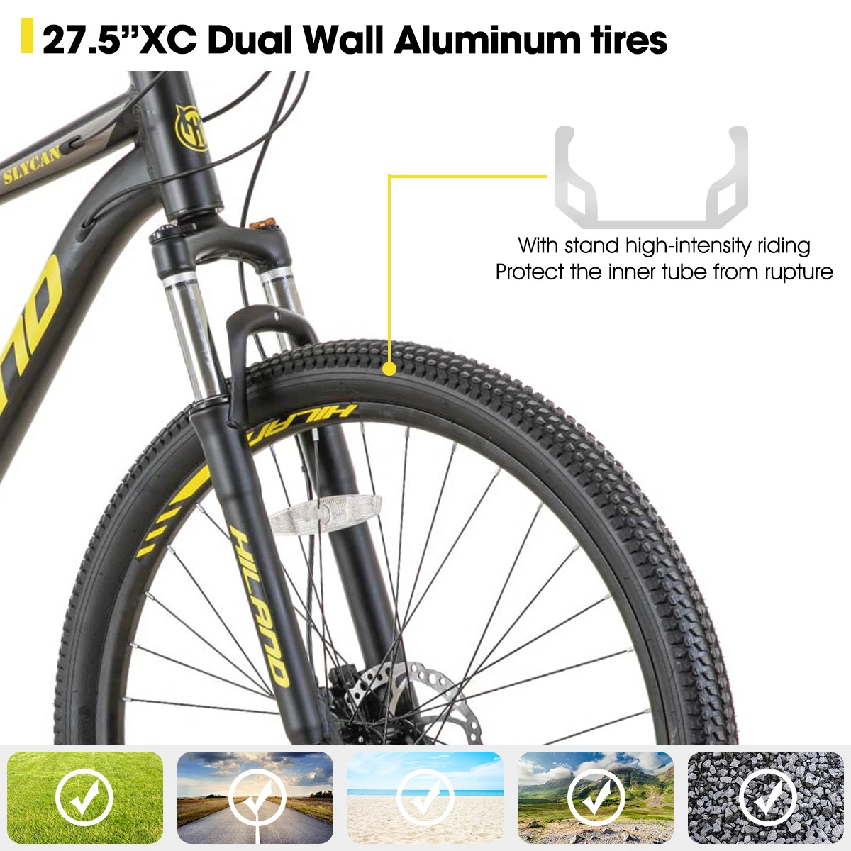 Product PostionHiland Slycan mountain bike is safe, comfortable ,sport and fast, enough for most riding scenes,handles trails, dirt paths,commute or the ride to work with ease. |