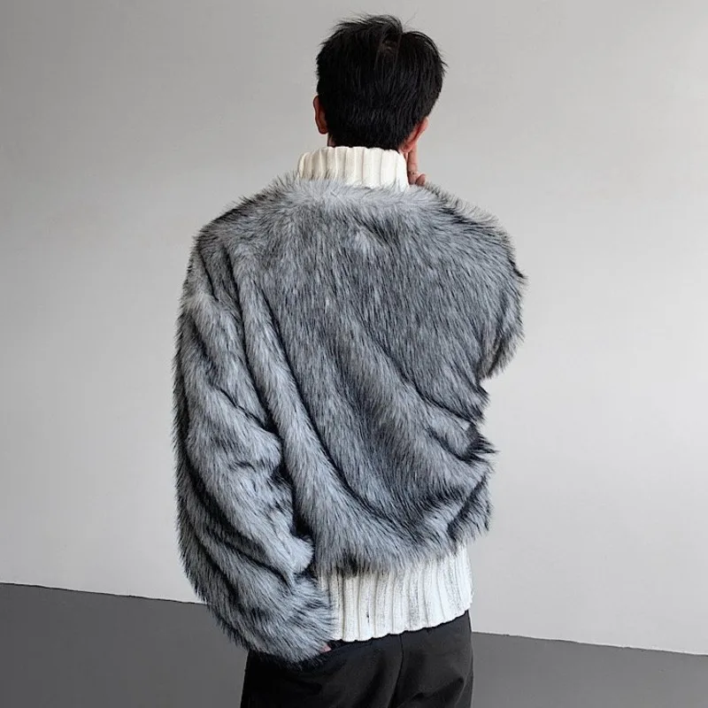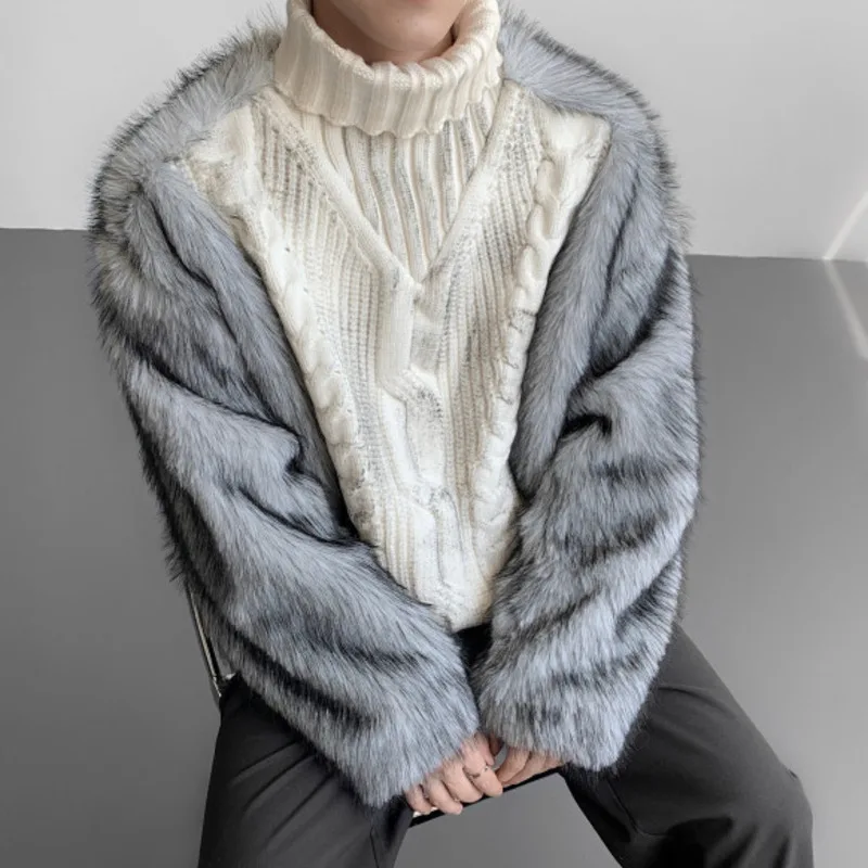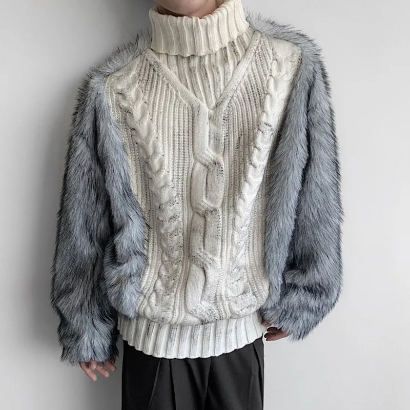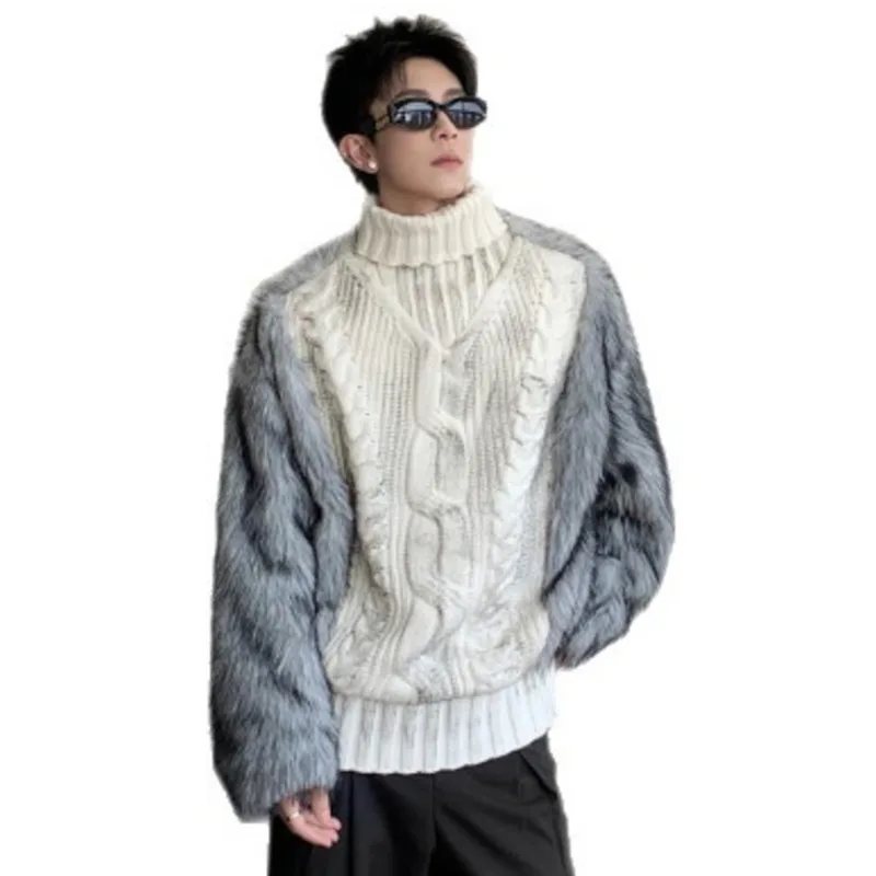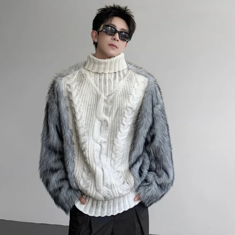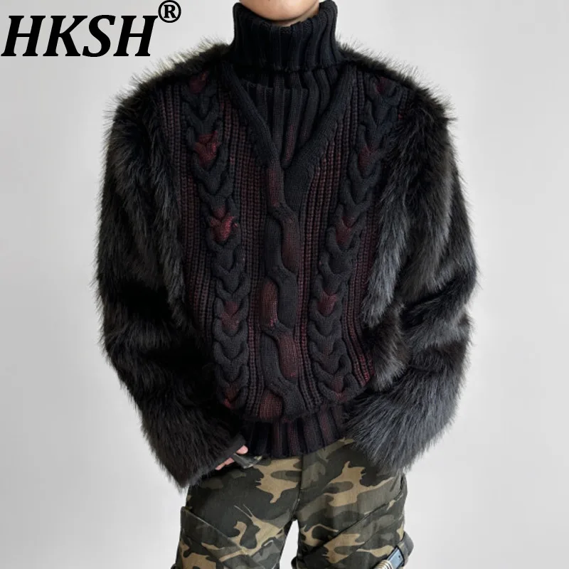 HKSH Autumn Winter New Men Trendy Design Thickened Turtleneck Sweater Faux Fur Plush Patchwork Twisted Knitted Pullovers HK16331
