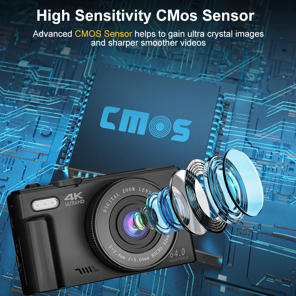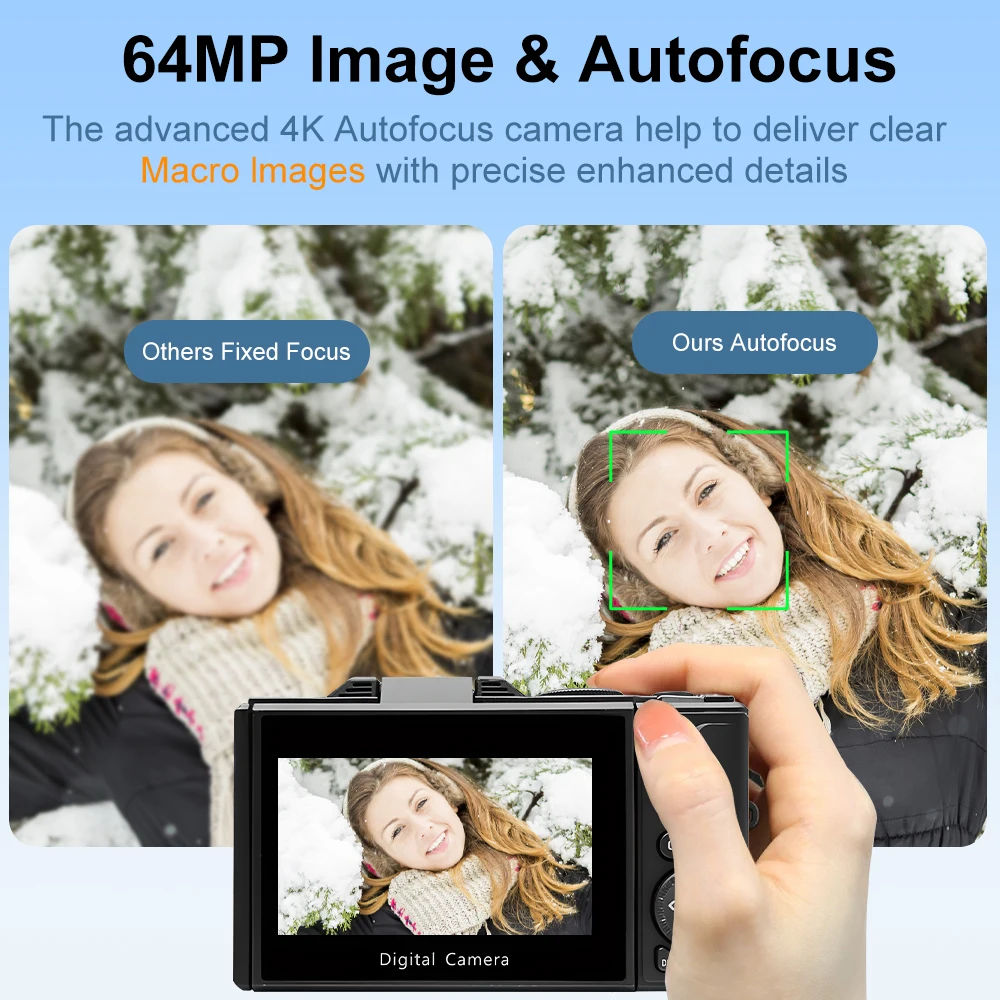 【64MP & UHD 4K Digital Camera】With its high-resolution 64-megapixel sensor, this camera can capture detailed images with rich colors and contrast. With its flipped 3-inch IPS screen and 4k video resolution, this video camera smoothly producess stabilized HD video.