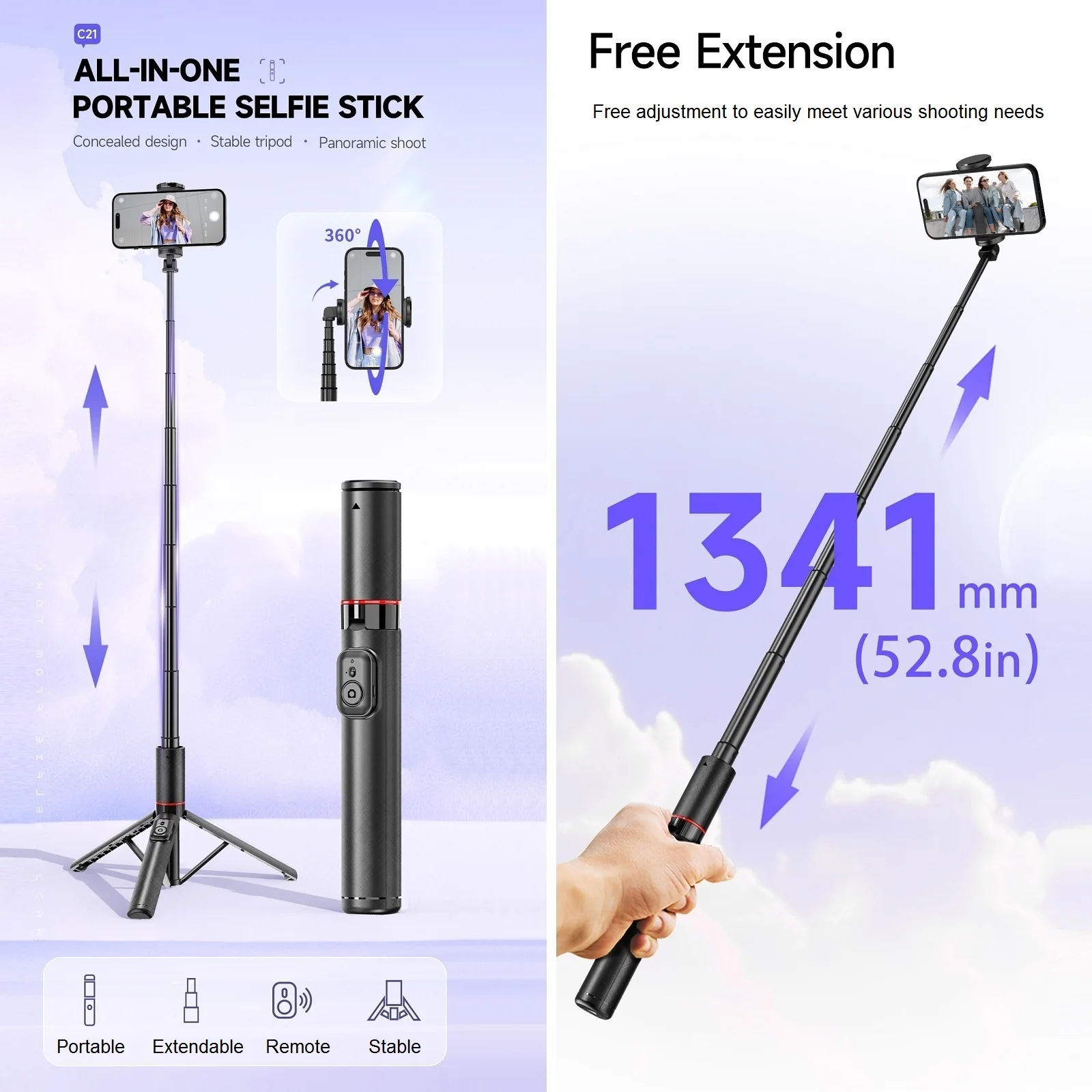 【All-in-one Selfie Stick & Phone Tripod】The C21 combines the functions of a phone tripod and a selfie stick, both to meet the needs of personal selfies for more than one person to provide a convenient way to take pictures together. And the tripodbase adopts a umbrella structure reinforced design with a silicone non-slip foot pad, which is more stable after unfolding and is not easy to shake, ideal for video recording, vlogging, party group photos.