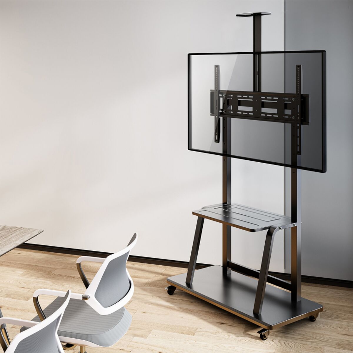 Il supporto TV FT100E-135 del marchio Aisens è un supporto TV da pavimento progettato per schermi fino a 100 pollici (2,54 metri) con una capacità massima di peso di 150 kg, garantendo un fissaggio stabile e sicuro per monitor o televisori di grandi dimensioni. Questo supporto è realizzato con materiali resistenti e duraturi, combinando acciaio per la struttura principale e plastica per alcuni componenti, con una finitura di colore nero elegante e discreta in ogni ambiente. La flessibilità e adattabilità sono altri punti di forza, poiché supporta un’ampia compatibilità di interfacce di montaggio VESA da 200 x 200 mm a 800 x 600 mm, permettendo di adattare il supporto a vari modelli e dimensioni di schermi da un minimo di 37 pollici (94 cm) fino al massimo indicato. Il design consente di regolare manualmente l’altezza in un intervallo da 1085 a 1475 mm, facilitando il posizionamento del televisore all’altezza ottimale per una visione comoda ed ergonomica. Dotato di quattro ruote con sistema di blocco, questo supporto è mobile, permettendo di spostare e posizionare facilmente lo schermo garantendo al contempo stabilità grazie alle ruote bloccabili. Include inoltre un vassoio funzionale per dispositivi ausiliari come lettori DVD o supporti per telecamere, aggiungendo praticità per presentazioni o ambienti professionali. Le dimensioni complessive del supporto sono di 1050 mm di larghezza, 570 mm di profondità massima e un’altezza totale di 2170 mm, assicurando una base solida e stabile. Viene fornito in scatola con kit di montaggio e manuale d’uso, pronto per un’installazione semplice e sicura. Grazie a queste caratteristiche, il supporto TV da pavimento Aisens FT100E-135 è una soluzione tecnica affidabile, robusta e versatile per chi necessita di un supporto resistente con mobilità e regolazione in altezza per schermi grandi in ambienti professionali o domestici.