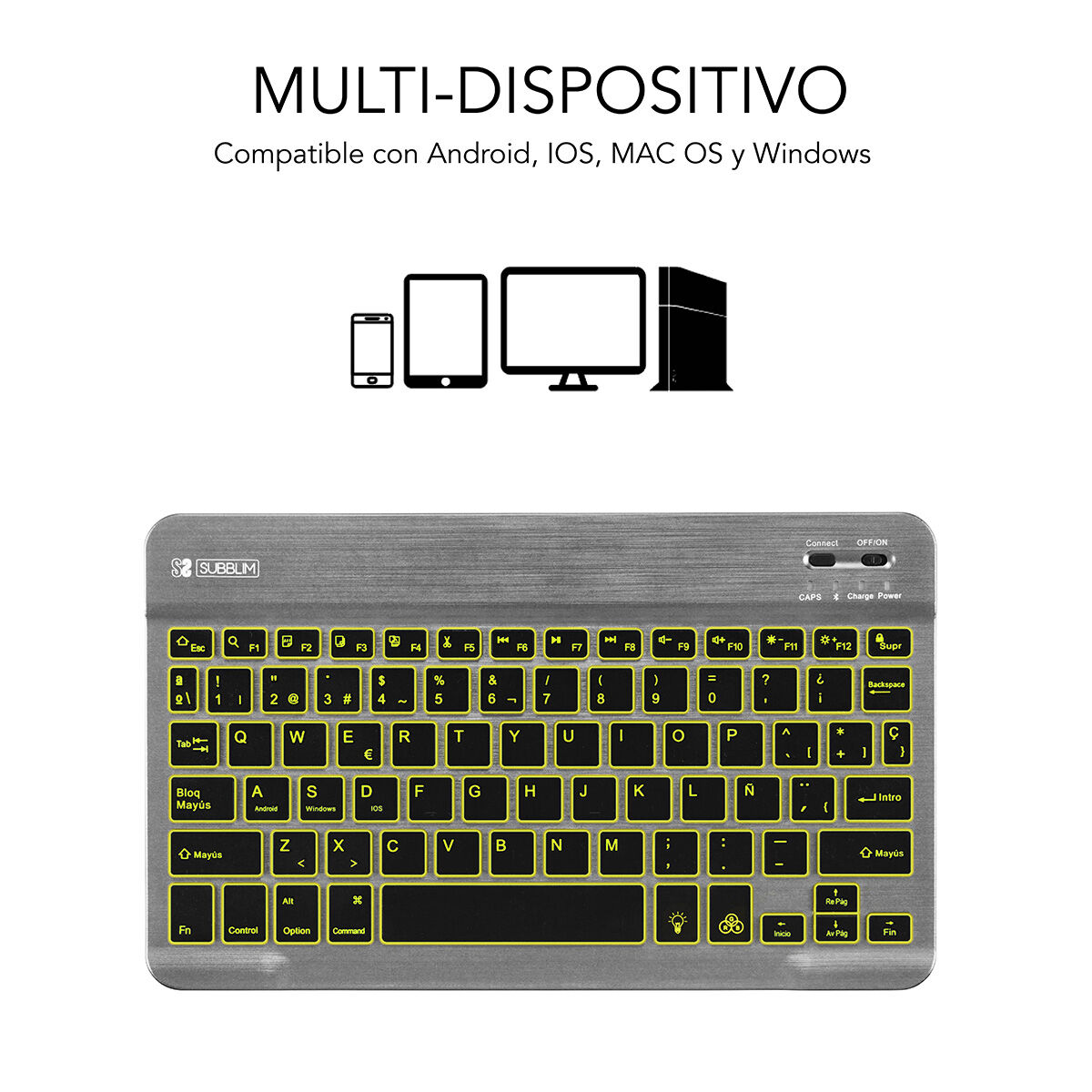 La tastiera Bluetooth SUB-KBT-SMBL31 di Subblim è un dispositivo compatto e funzionale progettato per offrire un’esperienza di scrittura comoda ed efficiente in ambienti che richiedono mobilità e ordine. Si presenta in un elegante colore grigio con layout QWERTY adattato alla lingua spagnola, facilitando una scrittura precisa e veloce in questa lingua. La sua connettività Bluetooth consente una connessione wireless semplice e stabile con dispositivi compatibili, eliminando la necessità di cavi e garantendo flessibilità d’uso in diversi spazi e situazioni. Questa tastiera è wireless, ricaricabile tramite connessione micro USB, offrendo autonomia e comodità senza il continuo cambio di batterie. Inoltre, dispone di funzioni di risparmio energetico come un sistema di spegnimento automatico e un interruttore di accensione e spegnimento per massimizzare la durata della batteria e assicurare che il dispositivo consumi energia solo quando in uso. La sua retroilluminazione intelligente migliora la visibilità dei tasti in condizioni di scarsa luce, facilitando il lavoro notturno o in ambienti poco illuminati senza compromettere l’efficienza. Questa tastiera è ideale per chi cerca compattezza senza rinunciare a una disposizione dei tasti familiare e completa in spagnolo, perfetta per professionisti e utenti che necessitano di mobilità e praticità per l’ufficio o l’uso domestico. Complessivamente, la Subblim SUB-KBT-SMBL31 offre un equilibrio tra design minimalista, tecnologia wireless avanzata e funzioni orientate al comfort e alla performance nella scrittura quotidiana.