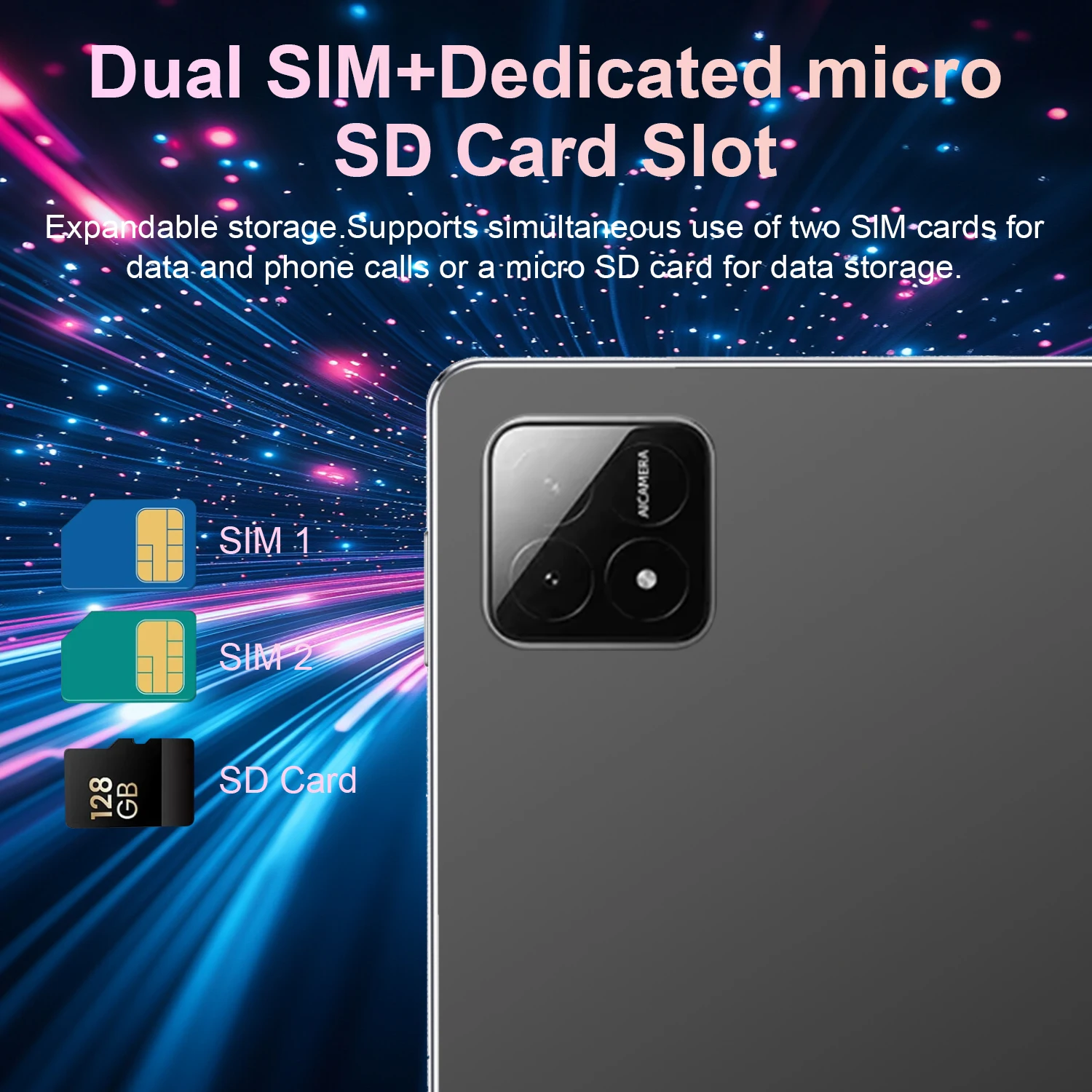 SIM/TF: 2 SIM Card Slots (Nano SIM) + 1 TF Card Slots (Maximum support 128GB extension)